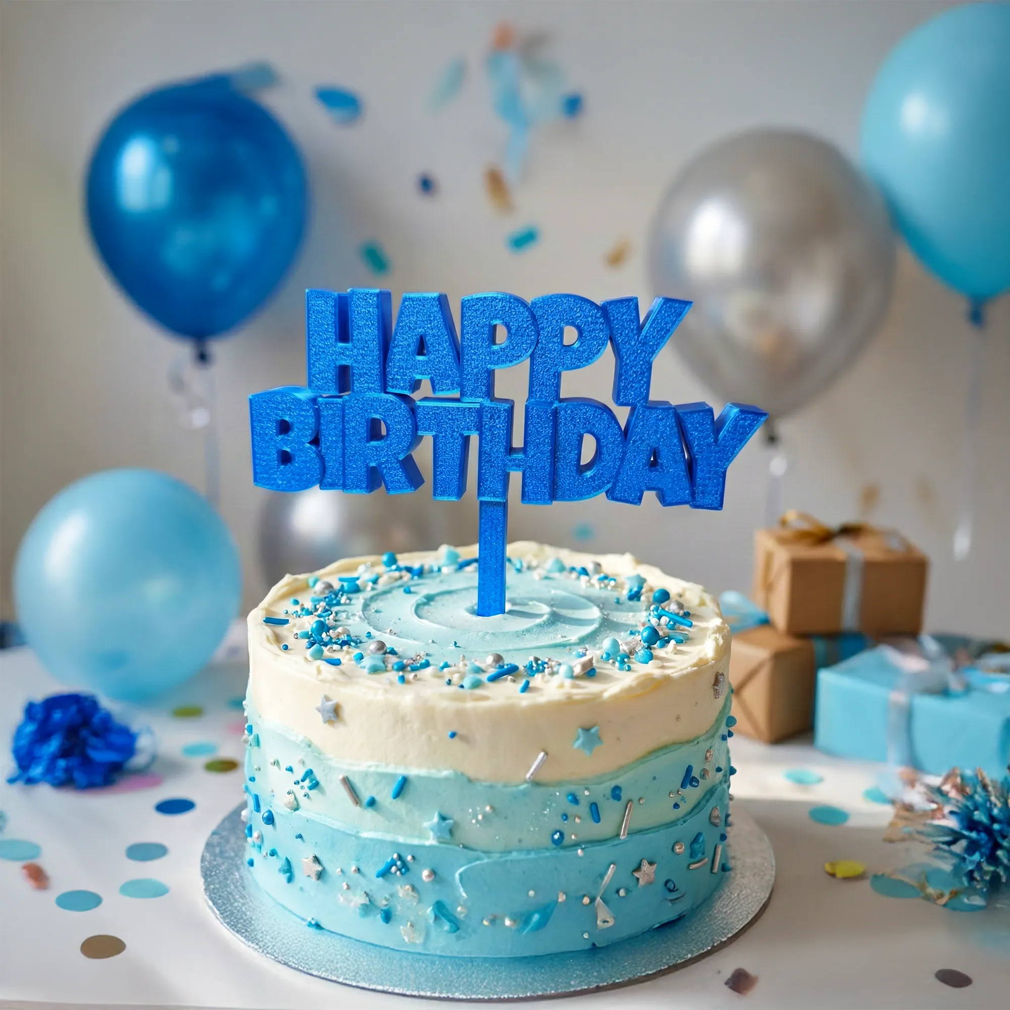 Elegancki topper na tort z napisem Happy Birthday wykonany w technologii druku 3D.