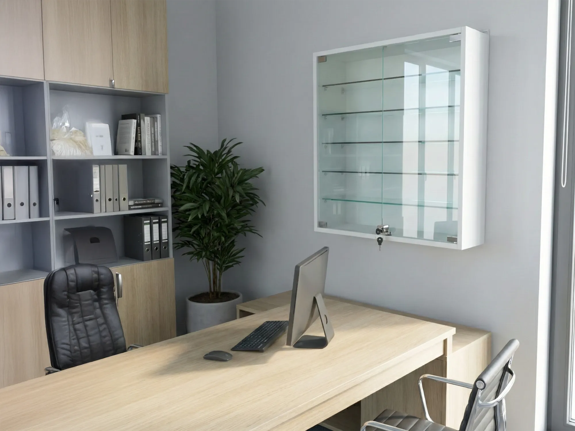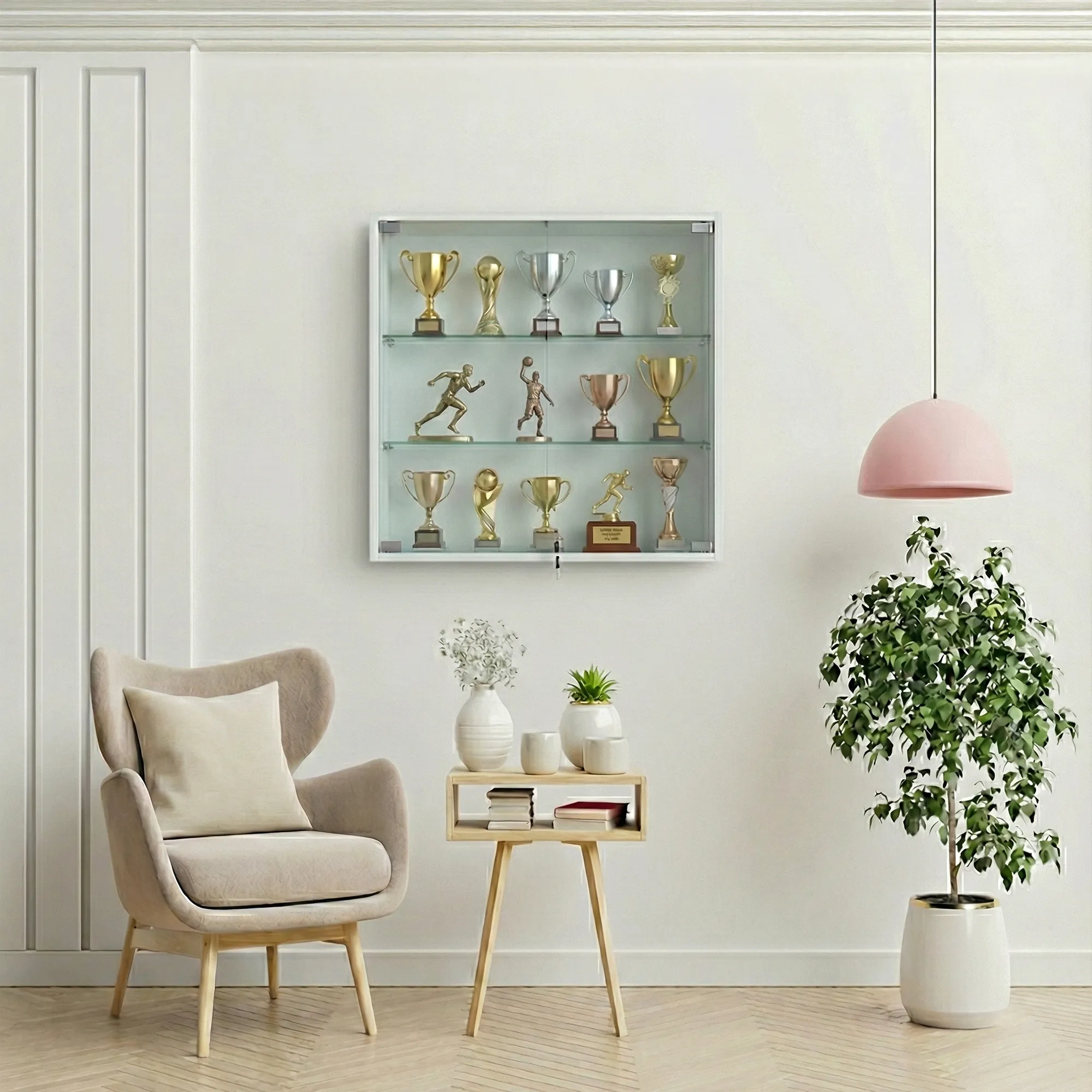 Witryna wisząca 680×680×170 mm z MDF-u, ze szklanymi drzwiami uchylnymi i szklanymi półkami.