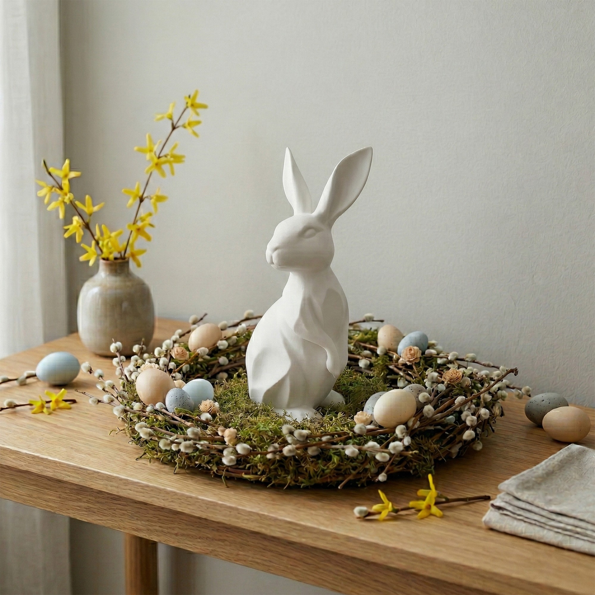 To figurka zajączka (królika) drukowana w 3D, świetna do kompozycji z baziami, świecami i wiosennymi kwiatami. Wygląda naturalnie, a przy tym nowocześnie – idealnie do jasnych, minimalistycznych wnętrz ✨