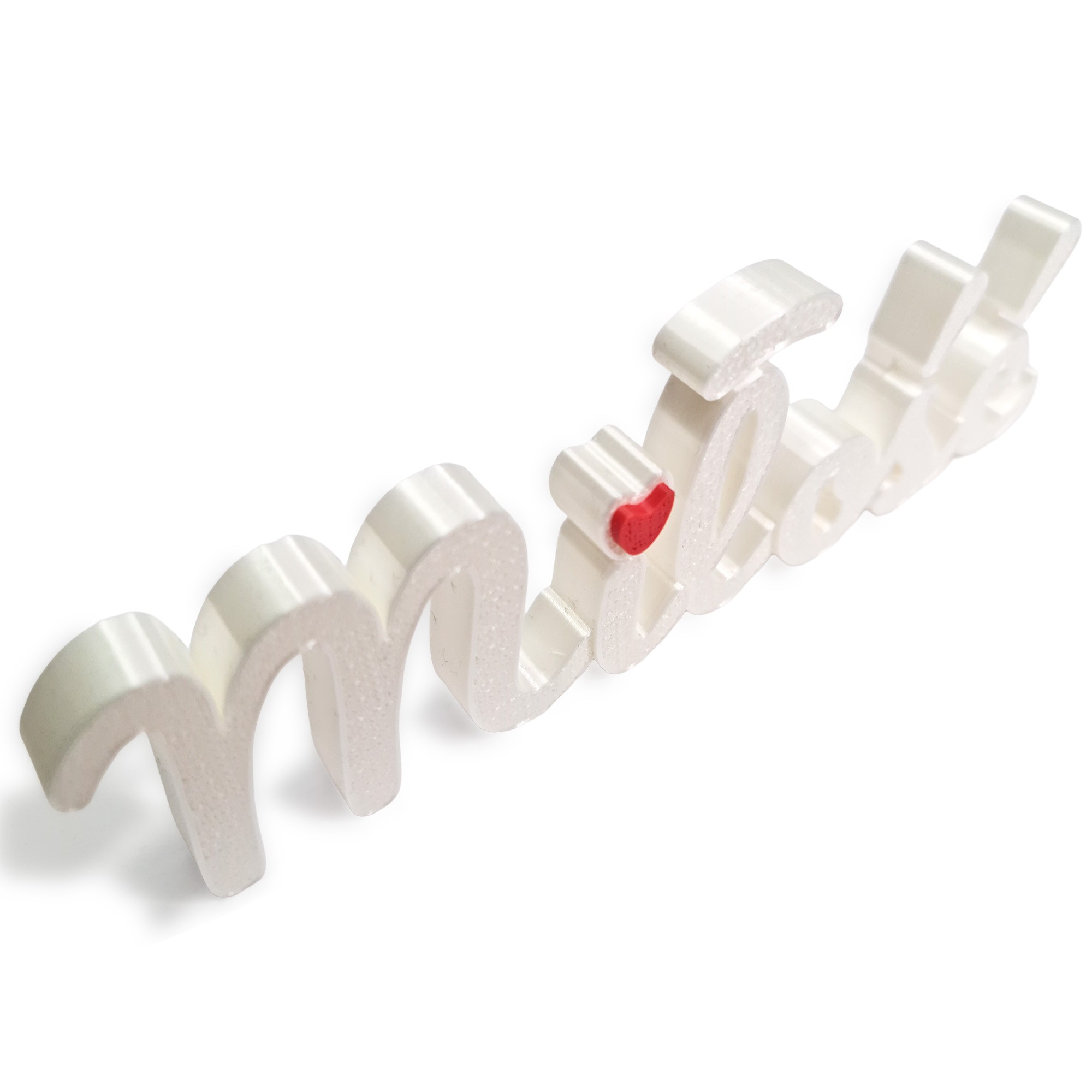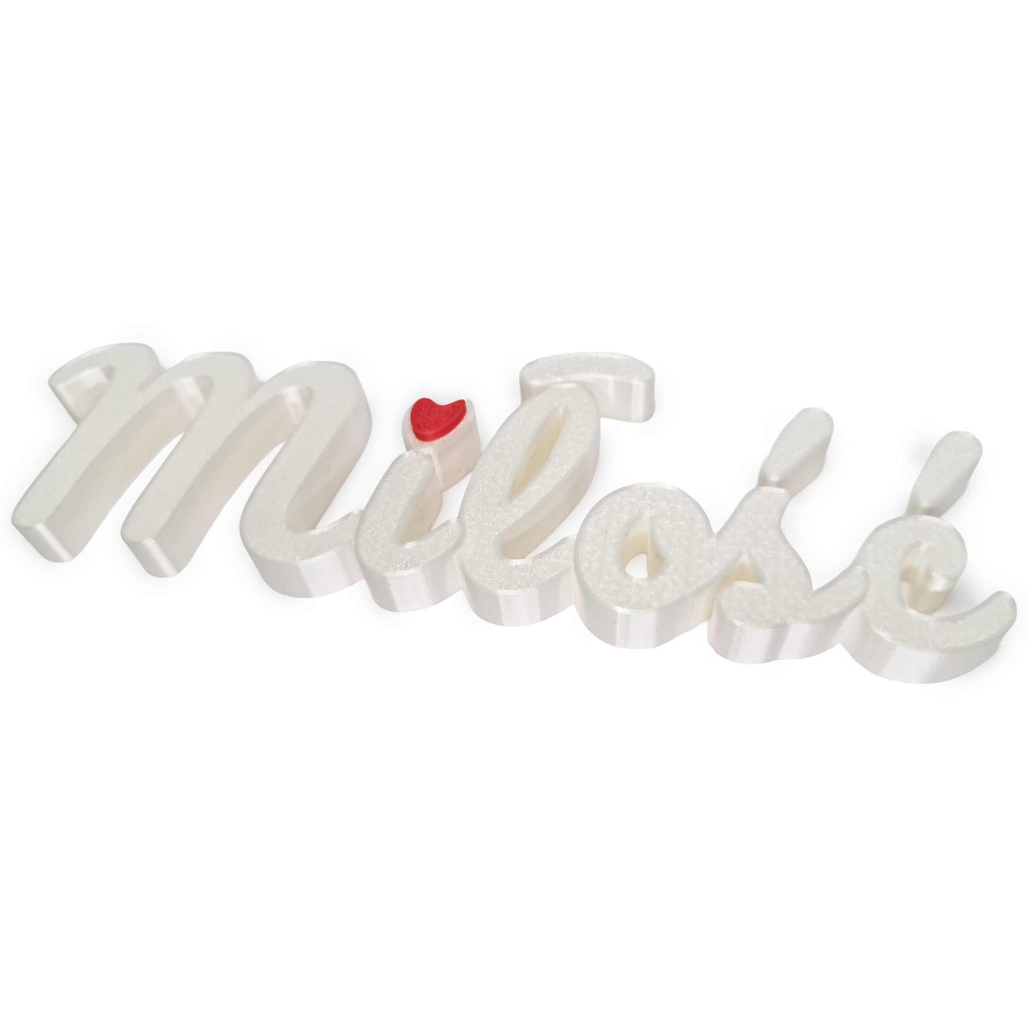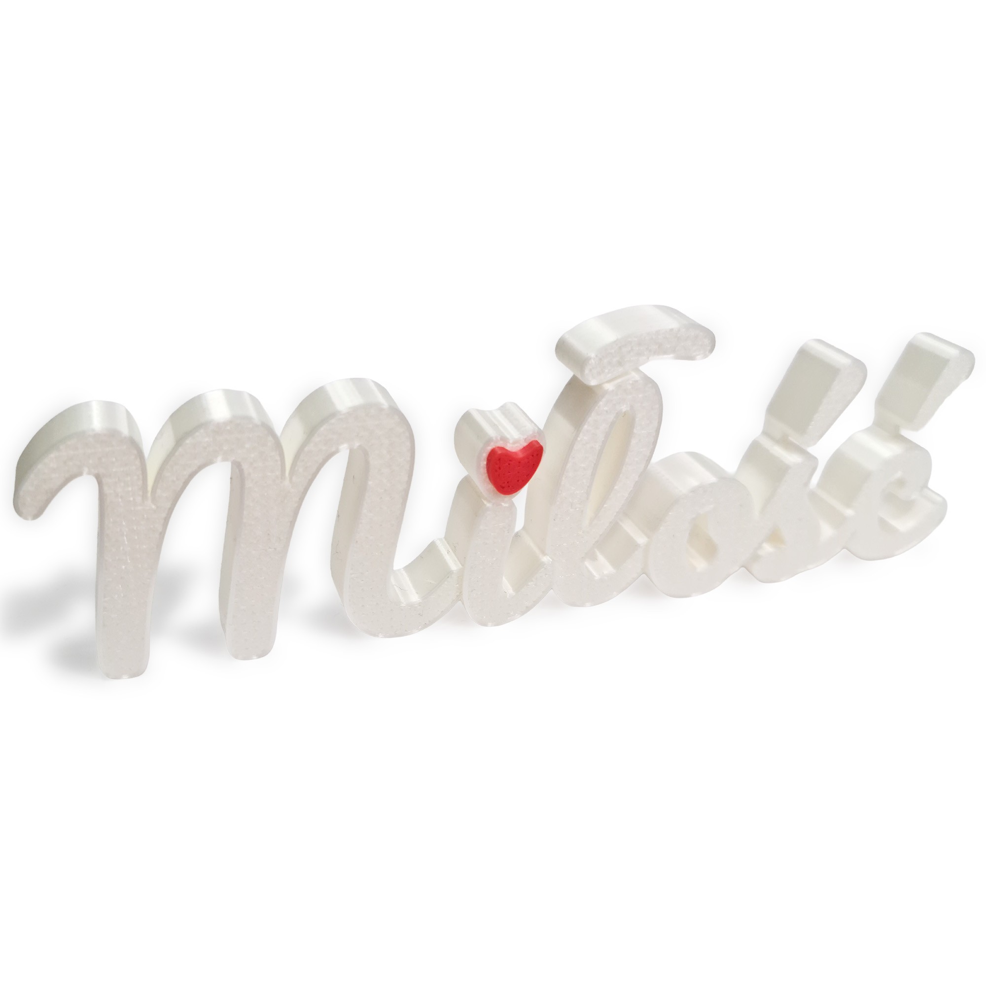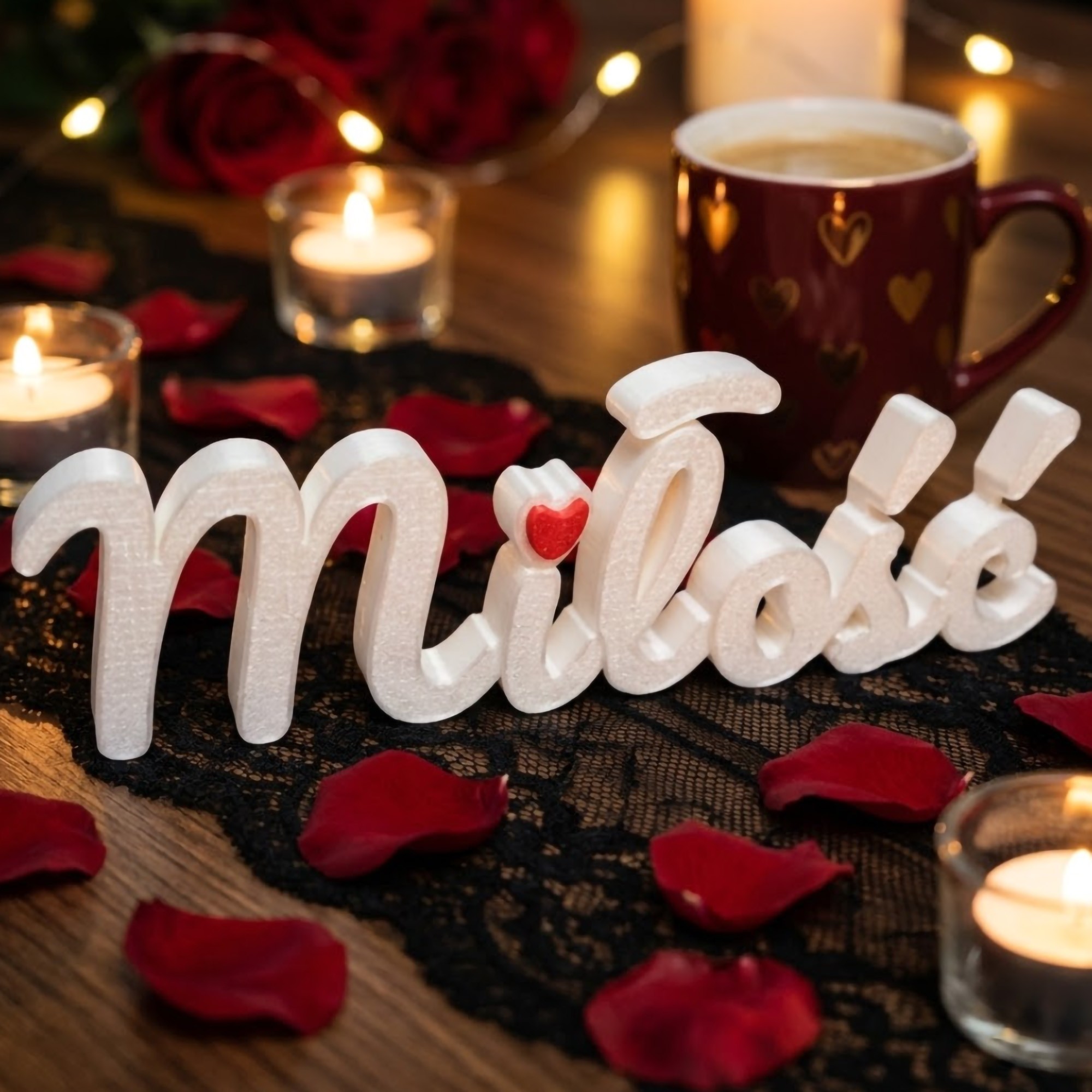 Napis „Miłość / Milosc” to autorska dekoracja wykonana w technologii druku 3D - lekka, estetyczna i pełna emocji. Idealna na półkę, biurko, komodę czy jako detal do wspólnego zdjęcia zakochanych 📸💑