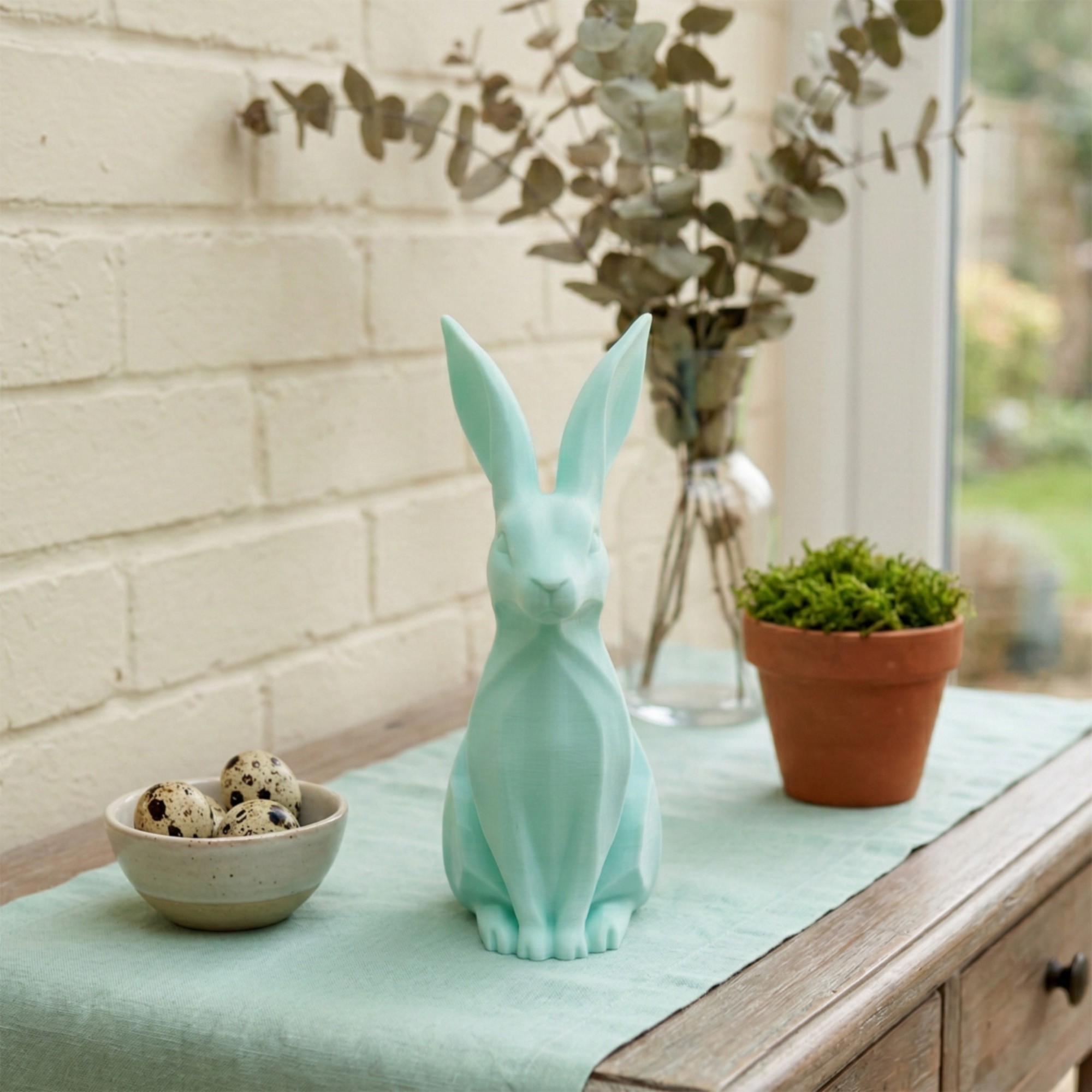 To figurka zajączka (królika) drukowana w 3D, która świetnie wygląda w stroikach, przy świecach, wśród bazi i kwiatów. Jest lekka, estetyczna i robi “miły klimat” bez przesady 🌸