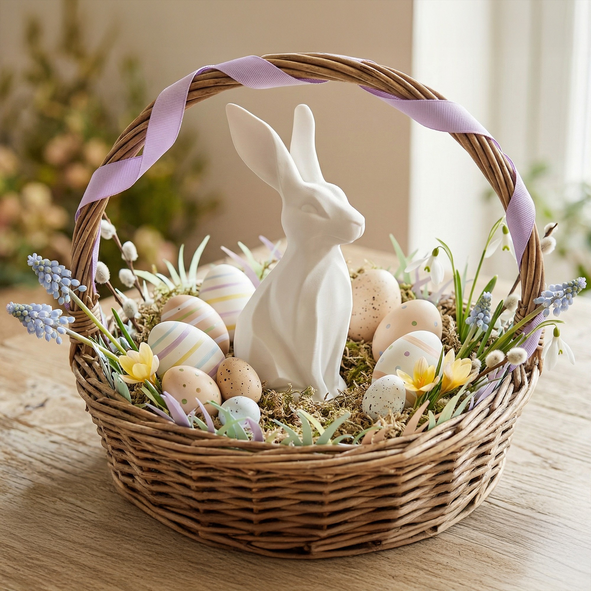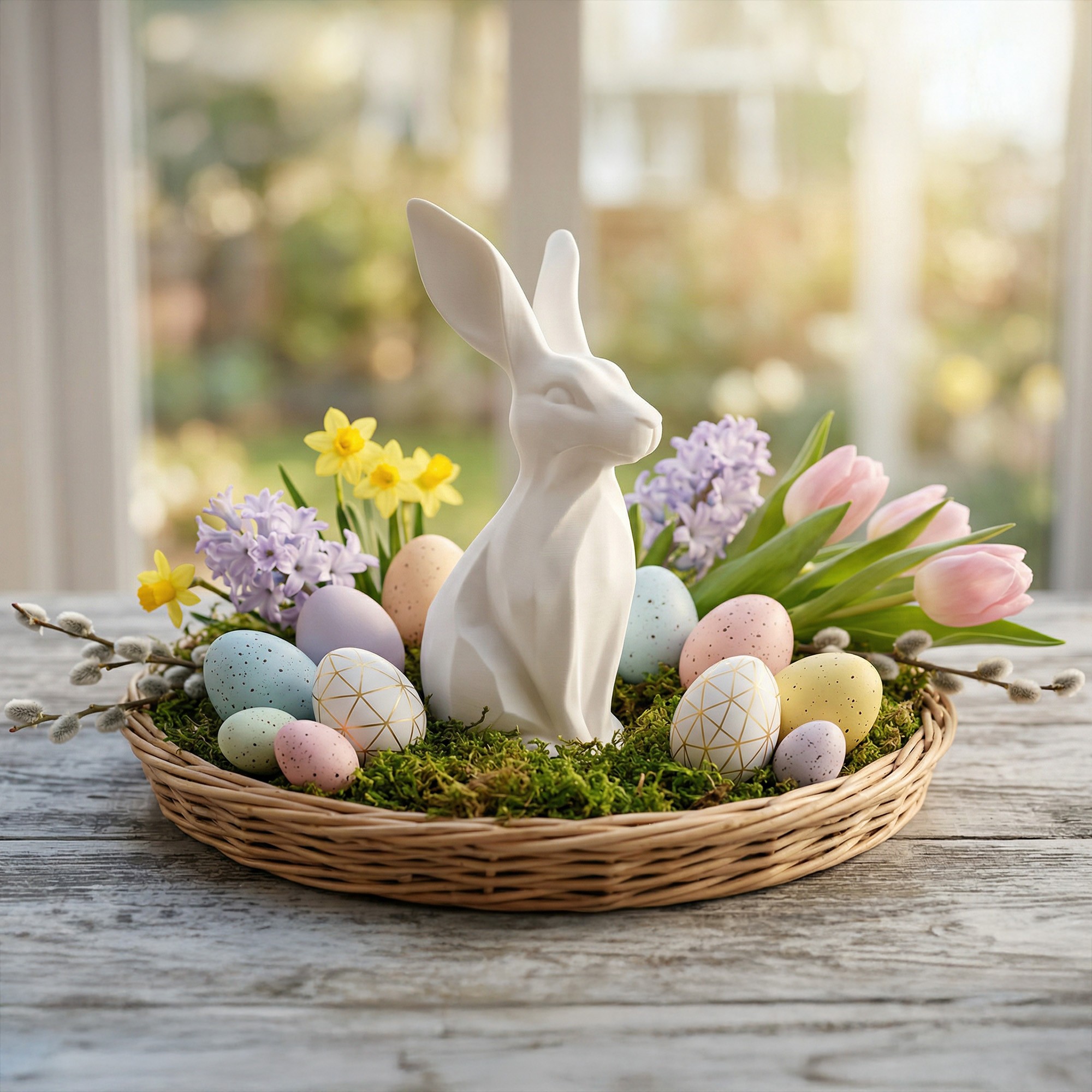 To figurka zajączka (królika) drukowana w 3D, która świetnie wygląda w stroikach, przy świecach, wśród bazi i kwiatów. Jest lekka, estetyczna i robi “miły klimat” bez przesady 🌸