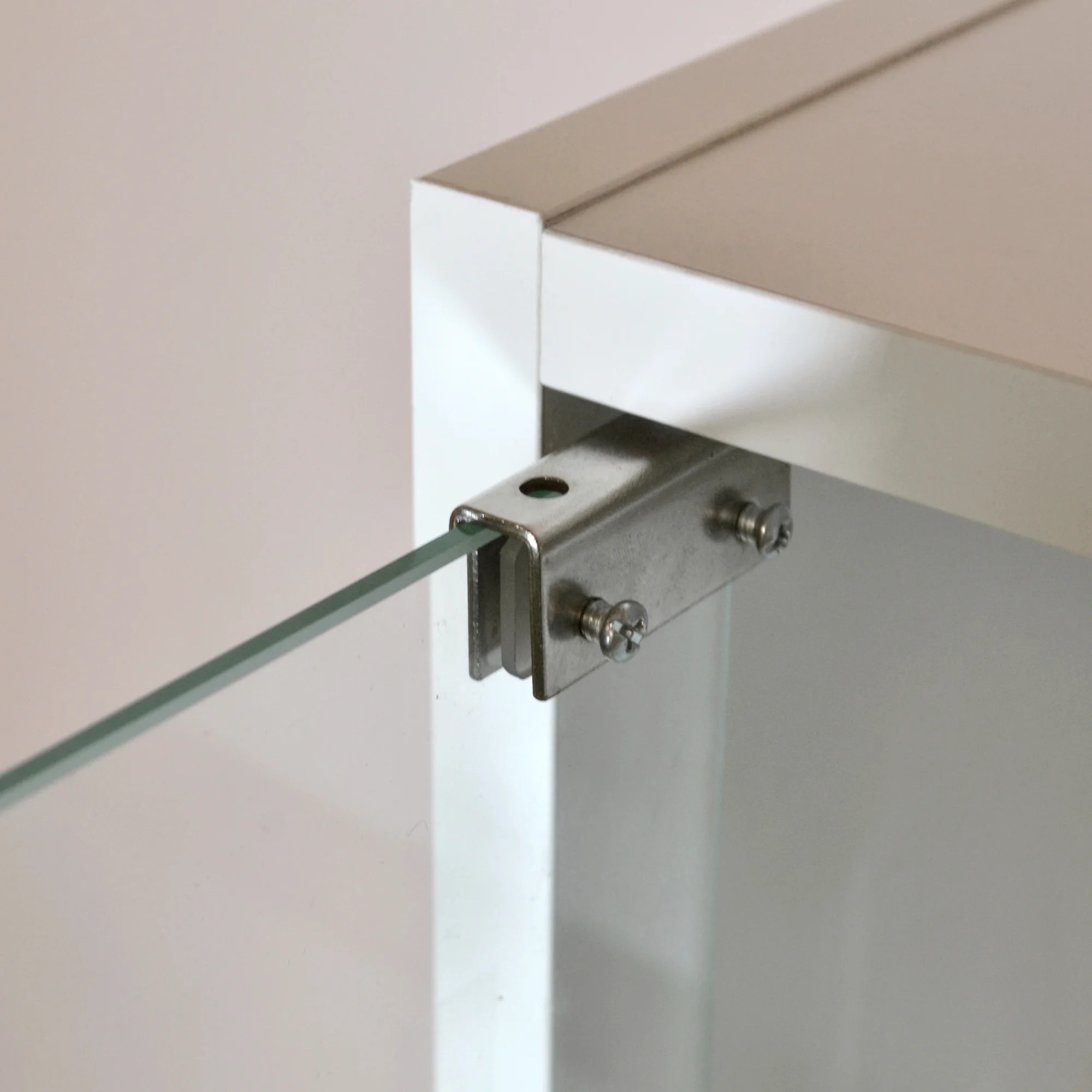 W przypadku ciężkich przedmiotów lub słabej ściany przymocować witrynę od dołu za pomocą kątowników meblowych (brak w zestawie).