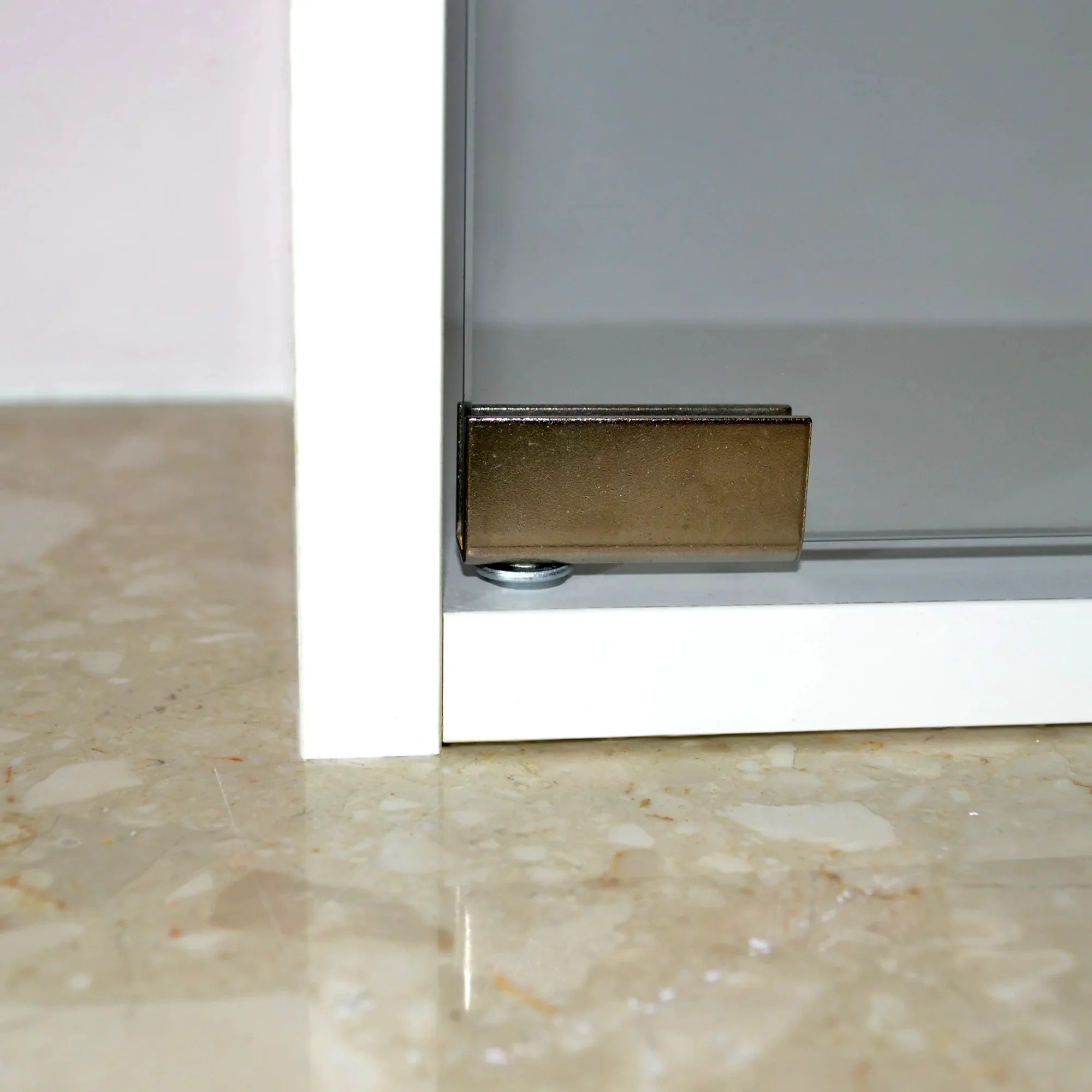 Zamocować dolny zawias na szklanych drzwiach. Uszczelki umieścić między śrubą a szybą, aby zabezpieczyć szybę podczas dokręcania (UWAGA: ZBYT MOCNE DOKRĘCENIE ŚRUB MOŻE SPOWODOWAĆ PĘKNIĘCIE SZYBY).